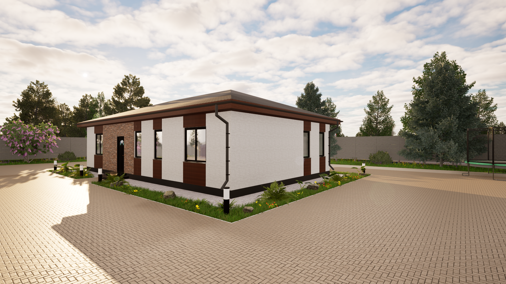 Вальмовая (четырехскатная), металлочерепица. Цвет кровли и водосточной системы по желанию заказчика.